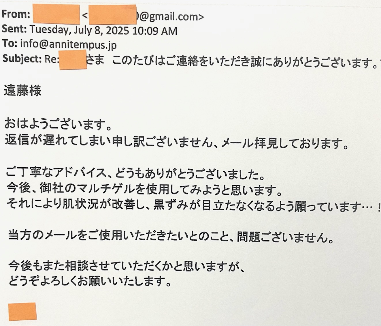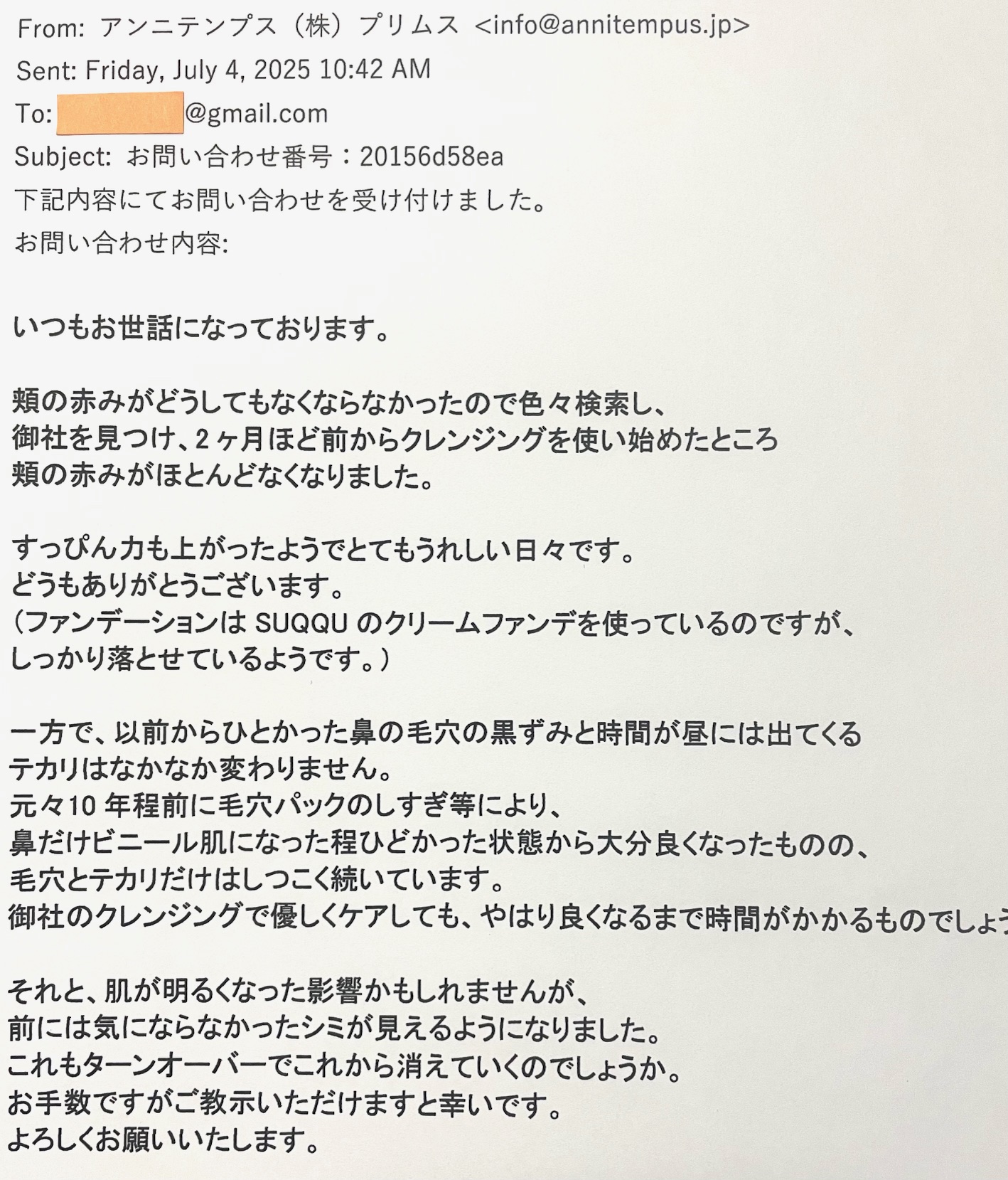 こちらのお声をいただいたお客さまはクレンジングご使用開始2か月後のこのタイミングでアンニテンプスの保湿美容ゲルクリーム(EGバイタライジング マルチゲル)を定期便でお買い上げいただきました。