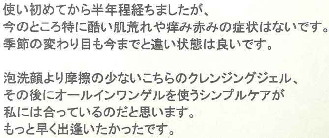 敏感肌で万年肌トラブルに悩まされ使える化粧品がなかなか見つからないというお客さまからのお声や酒さで皮膚科に通院中だったお客さまからも2か月後くらいに「真っ赤になることが無くなった」「チクチクも無くなった」「皮膚科の薬がもう必要なくなった」 などのこちらも驚くような嬉しいお声もたくさんいただいています